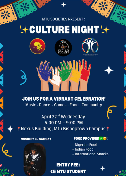 The event is for (international) MTU students. The event includes food, drinks, snacks, DJ, quizz, performance, raffle